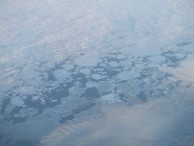 ロシアの西の端っこだったか、北欧だったか(忘れてる) 流氷です。雲で見えないけど、本当はもっとたくさんあるんだよ。